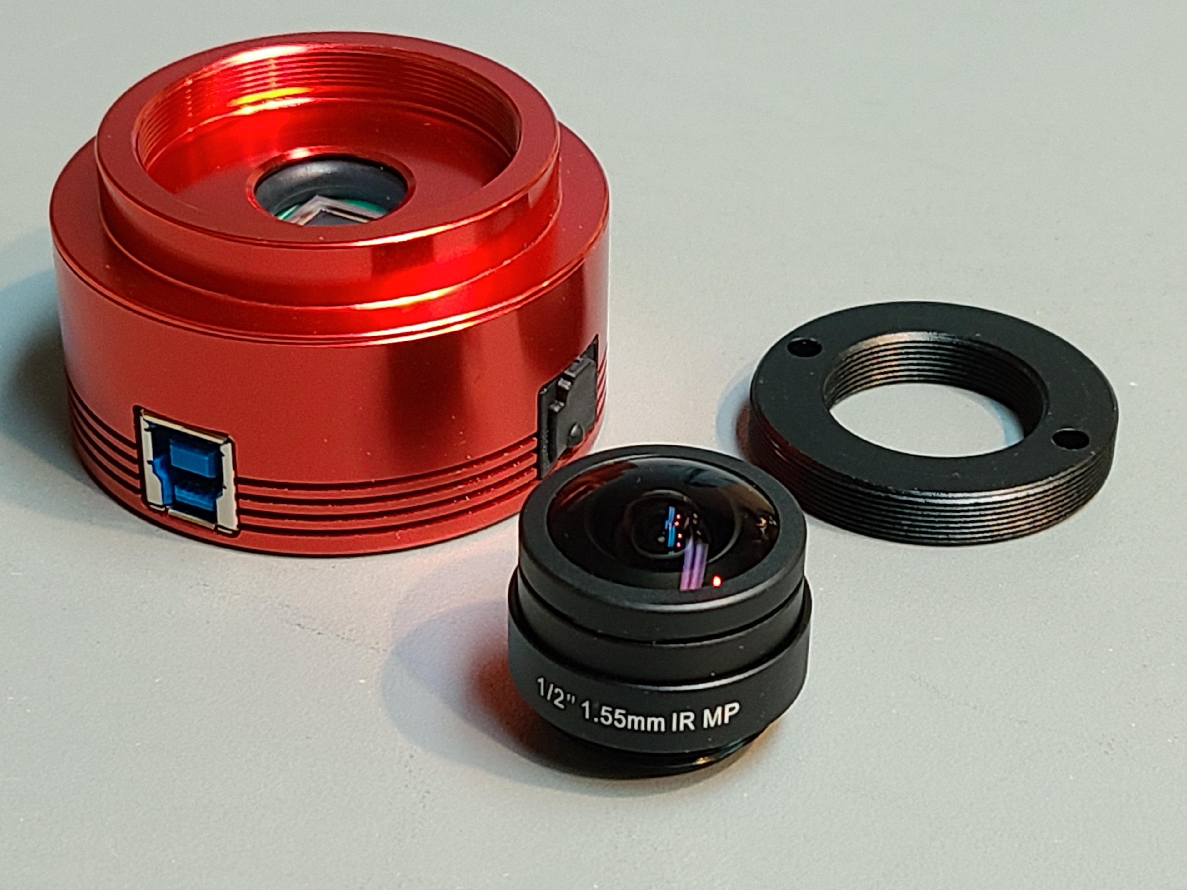 The ZWO ASI224MC comes with a 2.1mm 150deg lens. I elected to replace it with an Arecont Vision MPL1.55 1.55mm 180deg lens for a wider field of view.